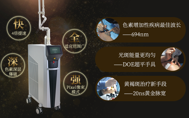 以色列第三代红宝石激光突破传统是Alma LasersTM的明星产品,是目前上最为全面的解决色素性皮肤问题的调Q激光技术,经过医生们的临床研究与实践操作,更是惊讶地发现宝石之光的的治疗效果好到连医生都难以置信!可解决超过90%的色素性皮肤问题,有“色素性皮肤治疗金标准”的美称。