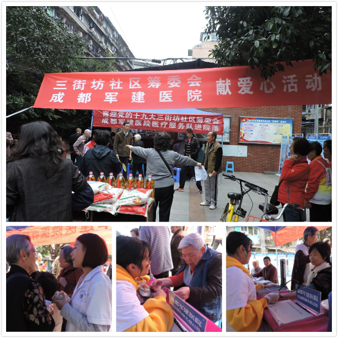 为喜迎党的十九大顺利召开,成都军建医院积极响应十九大的宗旨和精神,我们的医疗服务队于10月24日走进了三街坊社区,为居民免费测血压、血糖,热心为大家解答疾病困扰,同时还开展了一场温暖的献爱心活动,为贫困居民送去了油、米等生活物资,郑彬院长更是亲自将其递到了居民手中!
